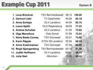CupCalculator is a program which calculates scorings from race results. It takes the runners’ race times and calculates points for every runner (and optionally also for teams) according to a set of rules which are specified in advance. This makes the point calculation a matter of a few clicks.